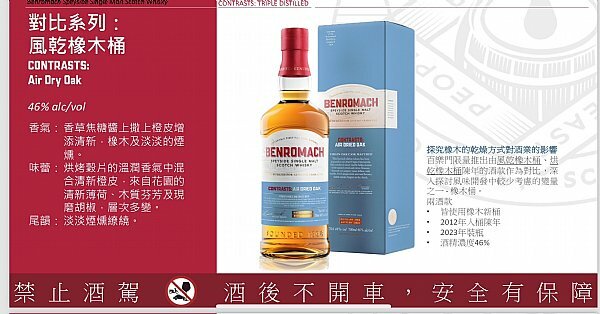 🌟香氣:經典的 Benromach 燒烤煙味,帶有溫暖的香草蛋奶醬、軟糖、杏桃和橙皮的味道,以及一絲皮革和雪茄盒的味道。