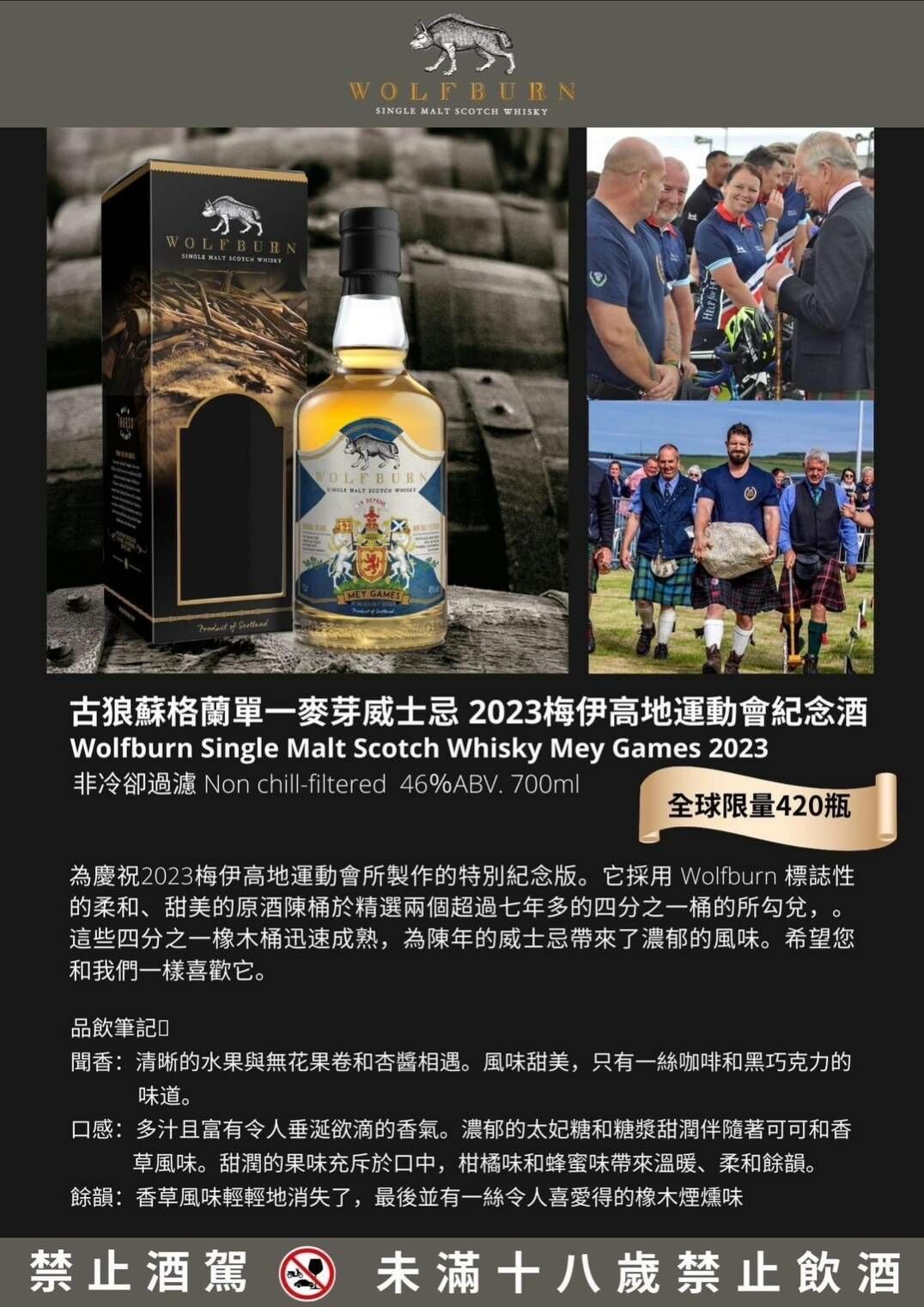 為慶祝2023梅伊高地運動會所製作的特別紀念版。它採用 wolfburn標誌性的柔和、甜美的原酒陳桶於精選兩個超過七年多的四分之一桶的所勾兌,。這些四分之一橡木桶迅速成熟,為陳年的威士忌帶來了郁的風味。希望您和我們一樣喜歡它。